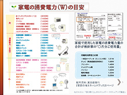 実際に家庭で使う時は、いろいろな使い方、モードで消費電力が違います。その時々の消費電力を調べるために、今日お配りしているエコキーパーなどの簡易型の電力計が役立ちます。